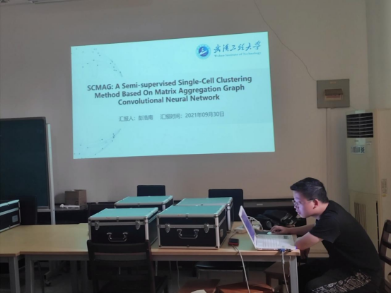 计算机专业彭浩南同学的报告题目为“SCMAG: A Semi-supervised Single-Cell Clustering Method Based On Matrix Aggregation Graph Convolutional Neural Network”。本次报告主要讲述了一个基于矩阵聚合图卷积神经网络的半监督单细胞聚类算法,图卷积神经网络将单元格之间的相似性转化为图中边之间的连接关系,然后利用卷积运算进一步提取边的分类特征。由于其强大的特征提取能力,该算法在半监督聚类中表现出很强的性能。然而,该算法在实际应用中需要调整很多参数,尤其是如何将细胞上基因的表达矩阵转化为能够有效反映细胞间相似关系的连接图是一个关键问题。 为了解决这个问题,报告人提出了 SCMAG。与传统的图卷积神经网络相比,将相似度矩阵通过不同的阈值划分得到不同的关联矩阵,然后构建最小距离矩阵,可以充分利用细胞中的高维信息,更好地反映细胞的特征。此外,报告人还测试了几种常用的半监督学习方法、标签传播、标签传播、自训练和普通 GCN 在相同条件下的细胞分类准确性。发现与其他四种竞争方法相比,SCMAG在分类准确度方面表现出最佳的平均性能。