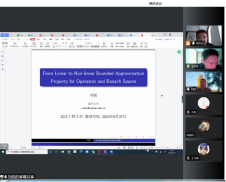 本网讯(通讯员:姚兴兴)6月27日下午,应英国正版365邀请,南开大学刘锐教授为公司师生做了题为《From linear to nonlinear bounded approximation property for operators and Banach spaces》的线上学术报告,公司部分教师和员工聆听了报告。