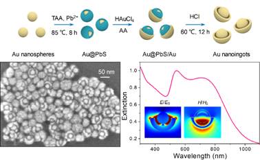 金属纳米颗粒的等离激元耦合效应能够产生极强的光子吸收和近场增强等优异光学特性,在催化、传感以及表面拉曼增强光谱等领域有着广泛的应用。马良博士利用可控水热法制备了一种新型的金纳米结构,称之为“纳米金元宝“,具体结构为直径20 nm的金纳米球精确地置于开口大小可调的半金壳层中,金纳米球和金纳米壳层之间有着约厚度为4 nm纳米间隙。理论和实验研究表明,纳米金元宝有着两种等离激元共振吸收峰,一种在550 nm处,属于电偶极共振;另外一种处于650 ~ 800 nm之间,来源于外层金纳米壳层的磁偶极共振。同时,金纳米球和壳层之间的强烈等离激元耦合能够极大的增强两种等离激元的共振吸收和局域电磁场。光催化降解对硝基苯酚和表面增强罗丹明B分子拉曼光谱实验结果表明,纳米金元宝展现出壳层大小依赖的光催化活性和SERS响应,相关研究成果以题目为《Structure-Adjustable Gold Nanoingotswith Strong Plasmon Coupling and Magnetic Resonance for Improved PhotocatalyticActivity and SERS》发表在ACSAppl. Mater. Interfaces2020, 12, 38554−38562。