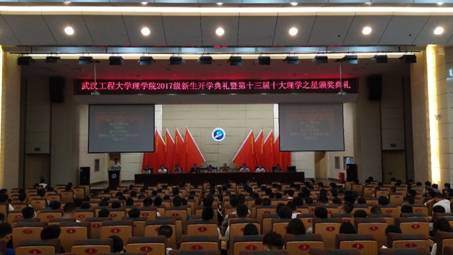 (通讯员丰苏)2017年9月9日上午8:30,理公司2017级新生开学典礼暨第十三届“十大理学之星”颁奖典礼在四教多功能报告厅举行。理公司党委书记江本武,副经理(主持工作)熊伦,党委副书记曾颖,副经理陈相柏、戴祖旭,团委书记刘华、部分教师代表、辅导员、班主任、本届“十大理学之星”获奖同学以及2017级全体新生参加了典礼。典礼由丰苏主持。