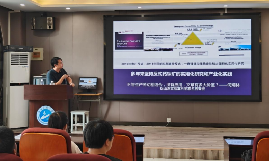 2024年9月11日下午,华中科技大学陈炜教授在公司2号实验楼401报告厅作“反式钙钛矿太阳能电池产业化”报告。他从效率、稳定性和成本“三要素”切入,剖析钙钛矿电池材料与器件结构演进,解读反式结构选择缘由,探讨成本对产业化影响,同时介绍武汉相关技术路线、现状及未来方向。陈教授强调学术与应用结合的重要性,鼓励研究生注重成果转化,其讲解引发师生对科研产业关系的思考,为研究生学业和职业发展提供了详实有效的指导。