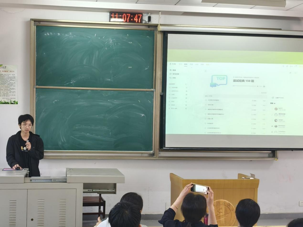 谢雨函同学则从就业的角度出发,分享了自己的求职经历。他详细讲解了如何在大学期间积累实习经验,提升自己的专业技能,以满足企业的用人需求。针对简历制作和面试技巧,他给出了许多实用建议,分享了面试 150 题及对应的回答思路,针对每类问题详细讲解了回答要点,他指出回答要突出与岗位相关的经历和技能,简洁明了地展示自己的优势,让同学们对求职过程有了更直观的感受。