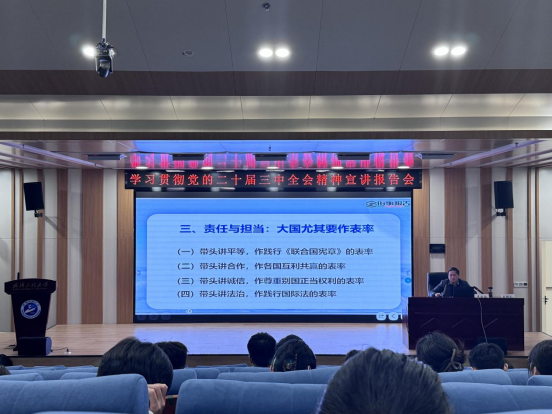 吴云韬以“推动和构建新时代的大国关系格局”为题,从国际格局深刻调整、呼唤大国协调合作、大国尤其要作表率、构建大国关系格局4个方面深入剖析了新时代的大国关系格局。他强调,全院师生要持续深入学习贯彻党的二十届三中全会精神,把学习贯彻全会精神与习近平总书记关于新型国际关系的系列重要论述紧密结合起来,自觉把学习成效转化为增强“四个意识”、坚定“四个自信”、做到“两个维护”的具体行动,以更加强烈的使命意识和担当精神,努力在构建相互尊重、公平正义、合作共赢的新型国际关系的伟大征程中走在前、作表率。