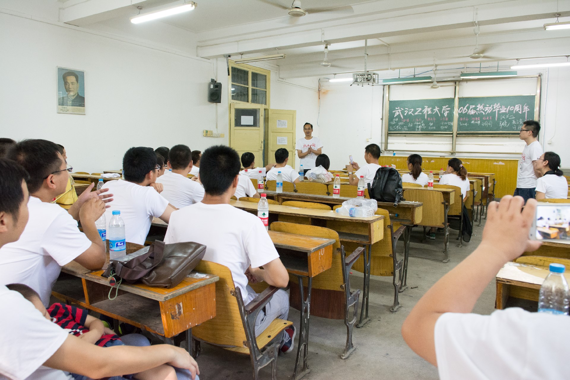 2016年8月13日上午,员工们先后参观了新老校区教学楼、图书馆、宿舍和操场等地,之后返回武昌校区,在十年前开班会的教室再次召开一场十年之后的班会。班会上,理公司经理熊伦代表公司对员工们的到来,表示热烈的欢迎,对员工们多年来给予公司的关心和支持,表示衷心的感谢,接下来他向员工们介绍了公司近年来在科学建设、团队队伍、人才培养、科学研究等方面的发展情况和取得的成果。