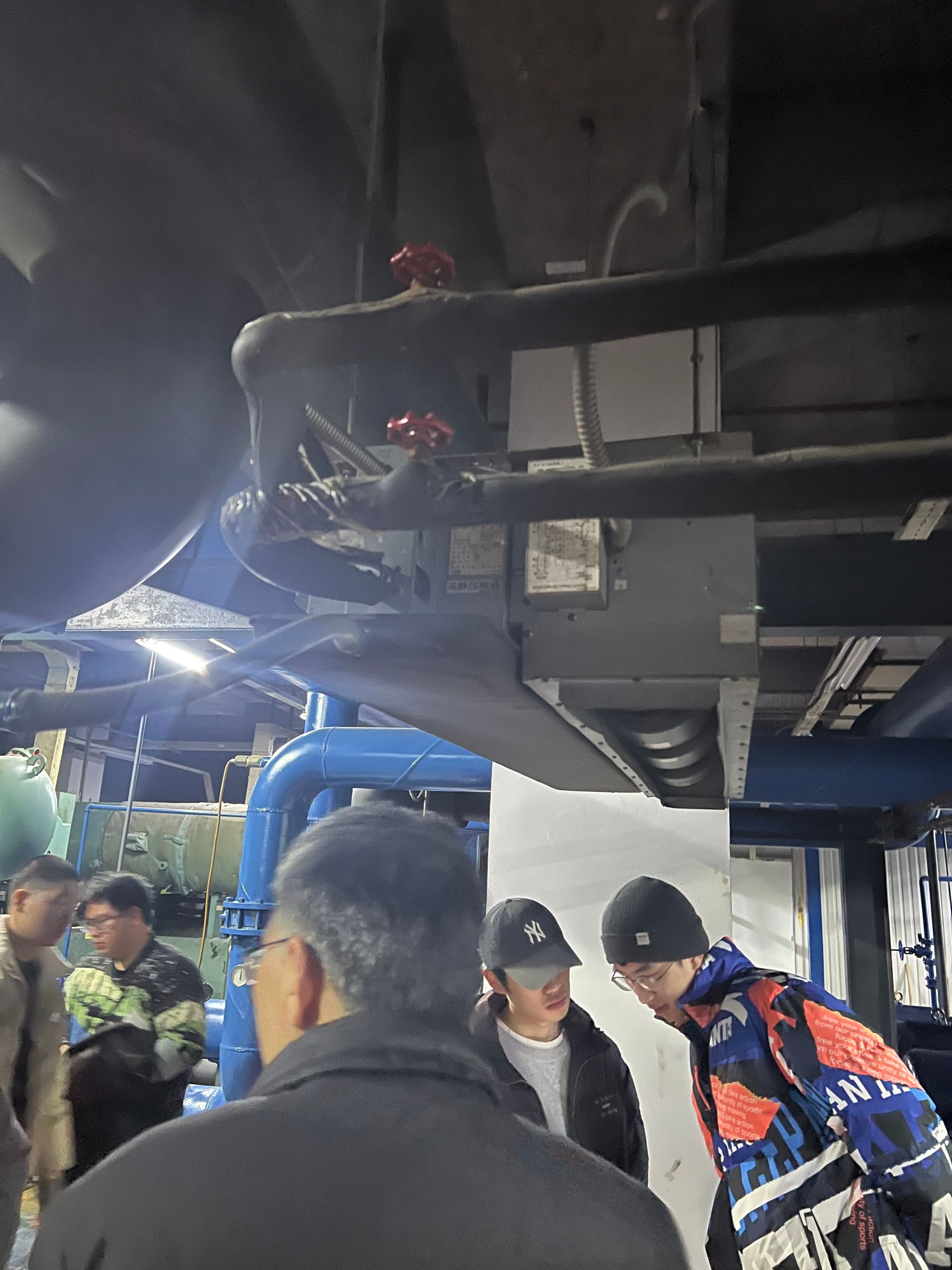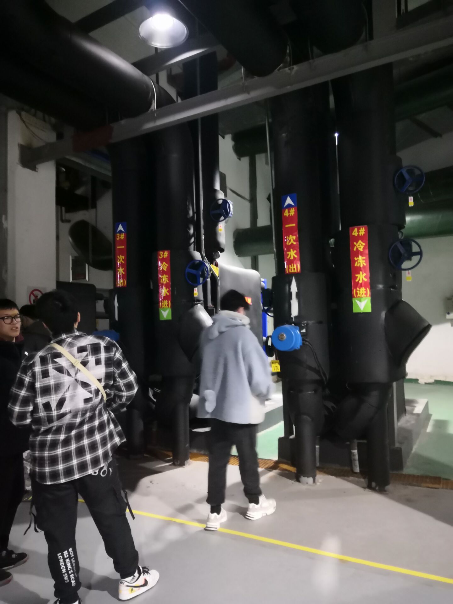 在这里20级能动员工分班分组,现场学习讨论,在带队老师讲解下,重点学习了1.双工况冷水机组与普通冷水机组异同;2.蓄冰槽的结构与工作原理;3.集水器和分水器的构造与接管;4.冷水机组、水泵、板换的工作原理与接管;5.热水锅炉及附属设备;6.平衡阀的设置与作用。