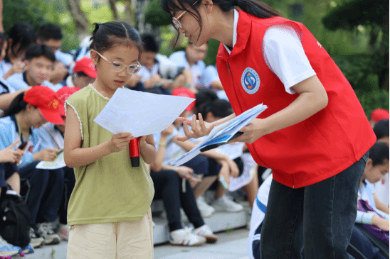 在讲解结束后志愿服务队就科普内容分发科普卡片,组织中小员工及长江小哨兵们分组讨论水的来源、净化过程,长江特有生物等问题。