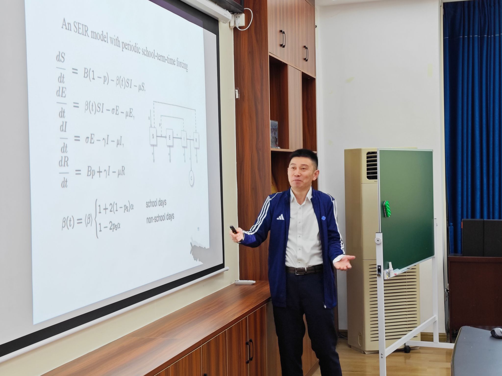 香港理工大学何岱海博士报告的题目为“1978年英国寄宿公司流感爆发:经典传染病模型失败的地方”。利用1978年英国著名的寄宿公司甲型H1N1流感爆发数据,介绍了所建立的SEIBCR模型,该模型基于延迟微分方程和虚拟子组来重现非指数停留时间,较好的拟合了B和C曲线以及发病率,对世代间隔和基本再生数的估计也比较合理。