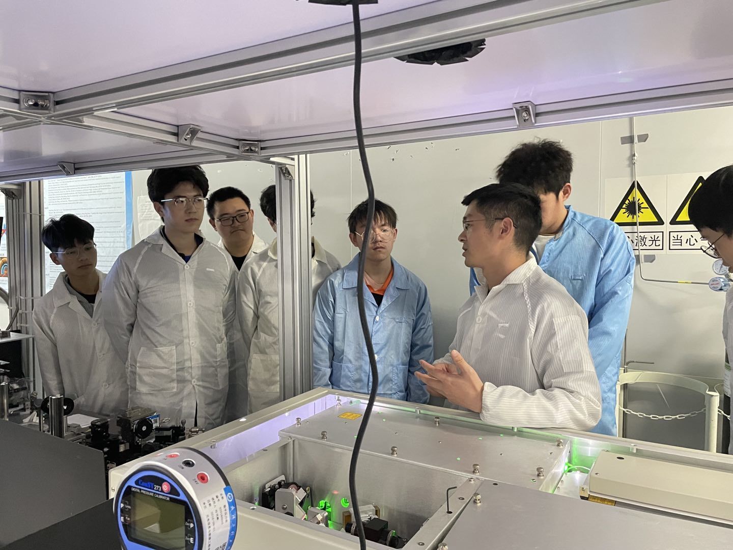 此次参观,各班在老师们的带领下分组观摩了超净间实验室与光学功能材料与器件实验室。在超净间中,同学们按要求换好防尘服,依次参观了光量子信息课题组、光纤传感课题组、超快光学课题组的实验平台,同学们了解了激光脉冲的产生、放大等物理现象,零距离揭开了光学的神秘面纱,刘书辉老师及研究生们也为大家进行了详细地介绍与答疑,光学平台上的各类仪器引起了同学们极大的兴趣。其中,潘子萌老师具体从实验平台搭建到维护的各个过程为同学们进行了讲解,并对员工们感兴趣的飞行时间测距传感器和真空腔体进行了介绍。