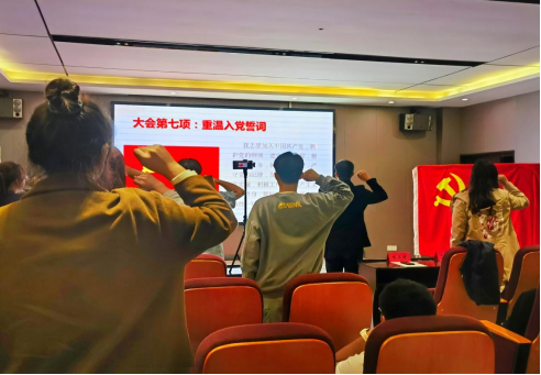 最后,会场内全体党员起立,党委副书记向翼凌带领全体党员在党旗下重温入党誓词,以铿锵誓言铭刻入党初心。