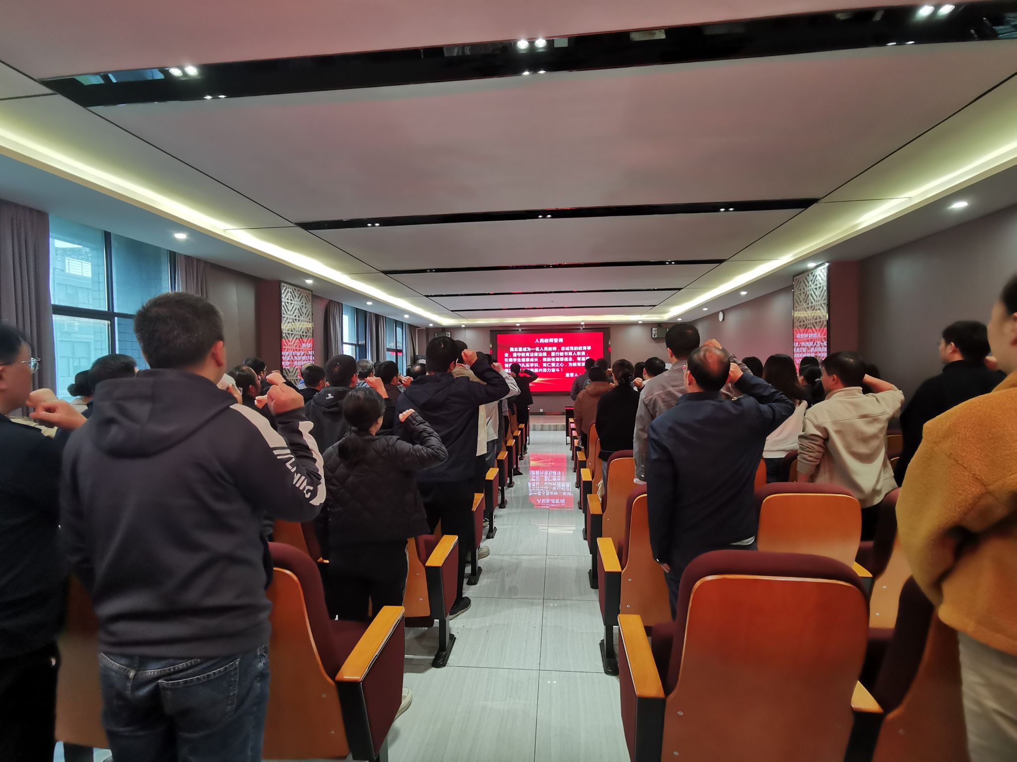 接着,公司举行了庄严的教师重温誓词仪式。在公司副经理李圆媛的带领下,全体教师高举右拳,郑重宣誓:“我志愿成为一名人民教师,忠诚党的教育事业,遵守教育法律法规,履行教书育人职责,引领员工健康成长,做到有理想信念、有道德情操、有扎实学识、有仁爱之心,为教育发展、国家繁荣和民族振兴努力奋斗!”激昂的誓言在会场久久萦绕,字字铿锵彰显教育初心,句句坚定诠释事业忠诚,宣誓仪式不仅深化了教师们的职业认同,更将职业荣誉感、责任感与使命感牢牢镌刻于心。