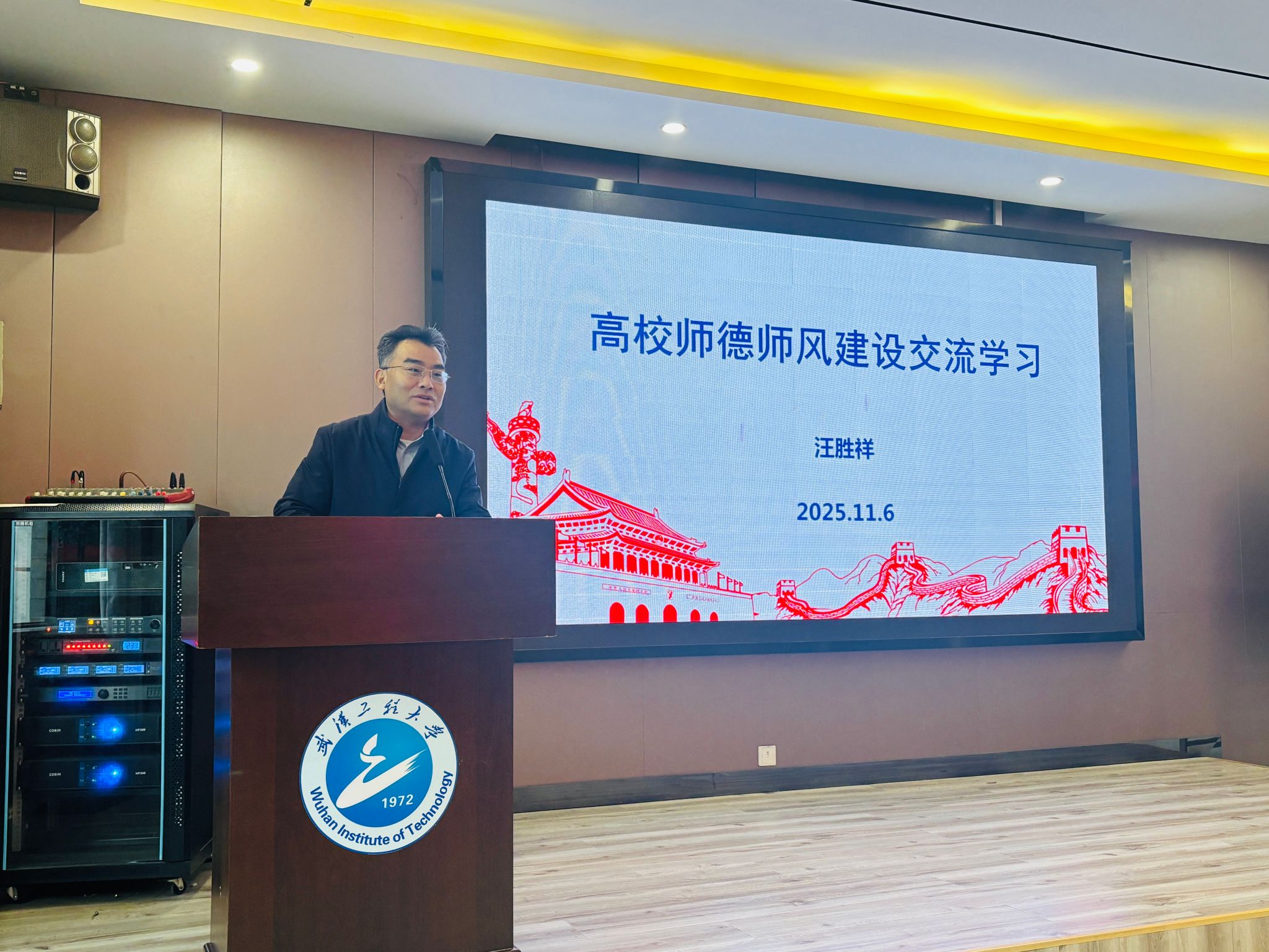 活动首先邀请武汉纺织大学研究生院经理汪胜祥作专题报告。汪教授以“高校师德师风建设交流学习”为主题,紧扣违反政治纪律、组织纪律、廉洁纪律、生活纪律、工作纪律五大维度,通过对“高校教师师德失范典型事例”的深入剖析,既精准点出当前师德建设中需警惕的潜在风险,更清晰勾勒出坚守师德底线、提升育人质效的实践路径与科学方法,内容深刻、发人深省,兼具鲜明的问题针对性与极强的实践指导价值。