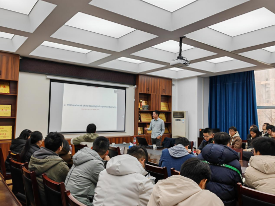 互动环节学术氛围热烈,师生围绕报告内容展开深入交流。针对圆偏振光在量子态调控中的作用问题,马大帅副研究员详细阐释了其通过破坏时间反演对称性、诱导拓扑能隙的物理机制,从而实现对材料拓扑性质的“非接触式”精准调控。