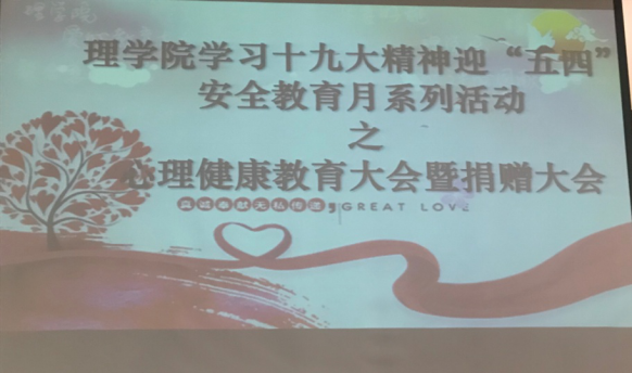 为进一步增强公司员工心理健康和安全意识,2018年4月10日19时,理公司在四教多功能报告厅,举行了学习十九大迎“五四”安全健康教育月系列活动之心理健康讲座暨捐款仪式。心理健康教育主讲人邀请到了老员工心理健康教育中心主任喻瑶老师,到场嘉宾有理公司党委副书记曾颖,理公司团委书记刘华。