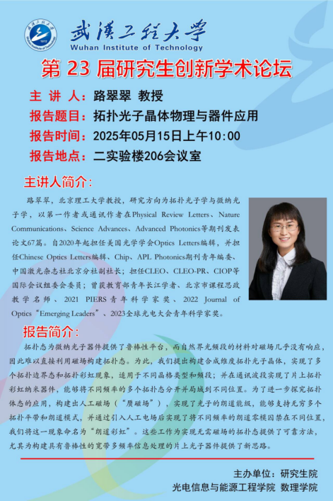【研究生创新论坛】拓扑光子晶体物理与器件应用--路翠翠 教授