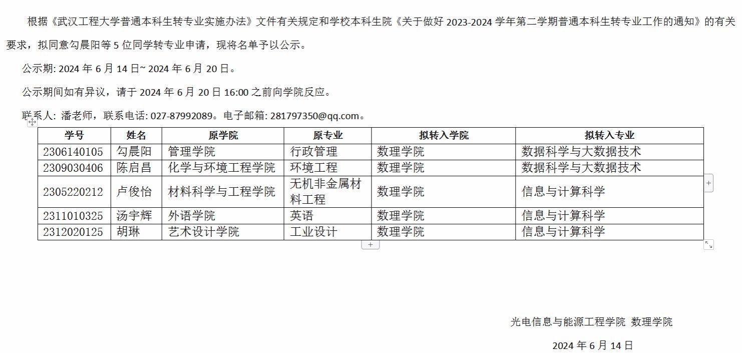 2023-2024学年第二学期普通本科生转专业员工名单公示