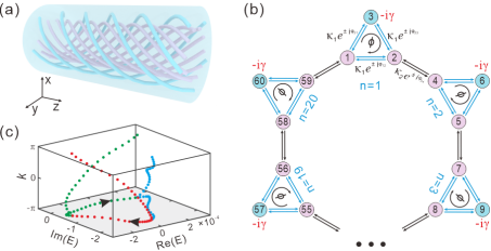 图1 (a)扭曲波导阵列图。(b)紧束缚模型。(c)周期性边界条件下的复特征能谱。