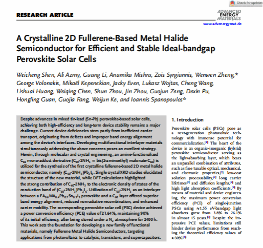 本网讯(通讯员 郑文文 王蓓)近日,2021级研究生慎炜程以第一作者在国际知名期刊《Advanced Energy Meterials》(中科院一区Top期刊,影响因子27.8)发表了题为《A Crystalline 2D Fullerene-Based Metal Halide Semiconductor for Efficient and Stable Ideal-bandgap Perovskite Solar Cells》的学术论文,英国正版365青年教师郑文文为论文第一通讯作者,365英国上市为第一署名及通讯单位。