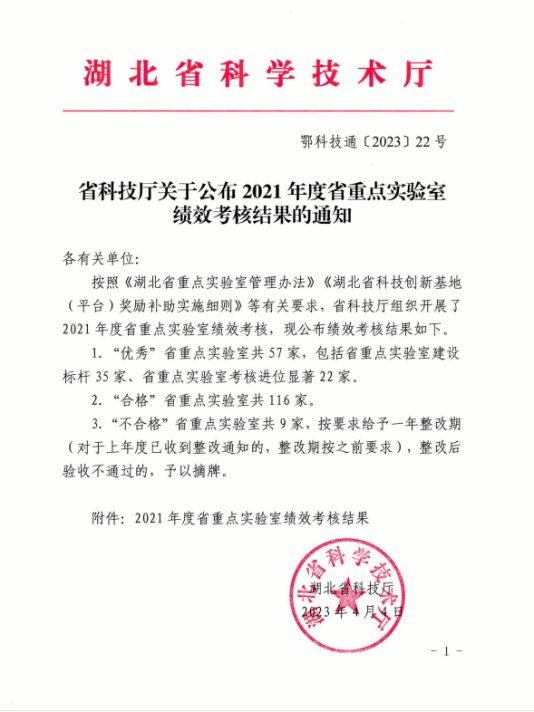 本网讯(通讯员 王蓓)近日,省科技厅公布了关于2021年度省重点实验室绩效考核结果的通知。其中,“优秀”省重点实验室共57家,包括省重点实验室建设标杆35家、省重点实验室考核进位显著22家;“合格”省重点实验室共116家。光学信息与模式识别湖北省重点实验室在评估中获优秀(标杆)。