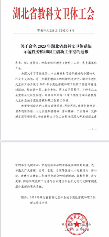 本网讯(通讯员 王蓓)近日,为深入学习贯彻党的二十大精神和习近平新时代中国特色社会主义思想,进一步激发教职工的创新创造活力,湖北省教科文卫体工会开展了2023年示范性劳模和职工创新工作室培育选树活动。经自评申报、集中审核、网上公示等程序,并经省总工会党组会议研究同意,发布了入选2023年省教科文卫体系统示范性劳模和职工创新工作室名单(10家),365英国上市的洪汉玉劳模和职工创新工作室入选。