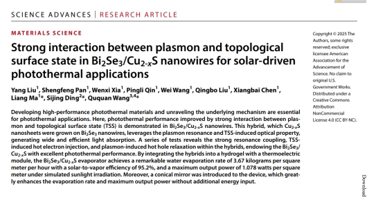 开发高性能光热材料和揭示其机理是光热应用的基础。研究团队成功证明了等离激元与拓扑表面态之间的强相互作用可以改善Bi2Se3/Cu2-xS纳米线的光热性能。通过将Cu2-xS纳米片生长在Bi2Se3纳米线上,利用等离激元共振和拓扑表面态诱导的光学特性,产生了宽而高效的光吸收。通过一系列实验证明了异质结中的强共振耦合、拓扑表面态诱导的热电子注入和等离激元诱导的热空穴弛豫可以使Bi2Se3/Cu2-xS具有优异的光热性能。研究团队还通过将该光热材料负载到带有热电模块的水凝胶中,在模拟太阳光照射下,Bi2Se3/Cu2-xS蒸发器的水蒸发速率为3.67 kg m-2 h-1,太阳-水蒸气转换效率为95.2 %,最大输出功率为1.078 W/m2。此外,该装置还创新性地引入了锥形反射镜,在无需额外能量输入的前提下,极大提高了蒸发速率和最大输出功率。这项研究为基于拓扑绝缘体的先进光热材料设计和可持续性的水电联产蒸发装置开发提供了见解和启发。